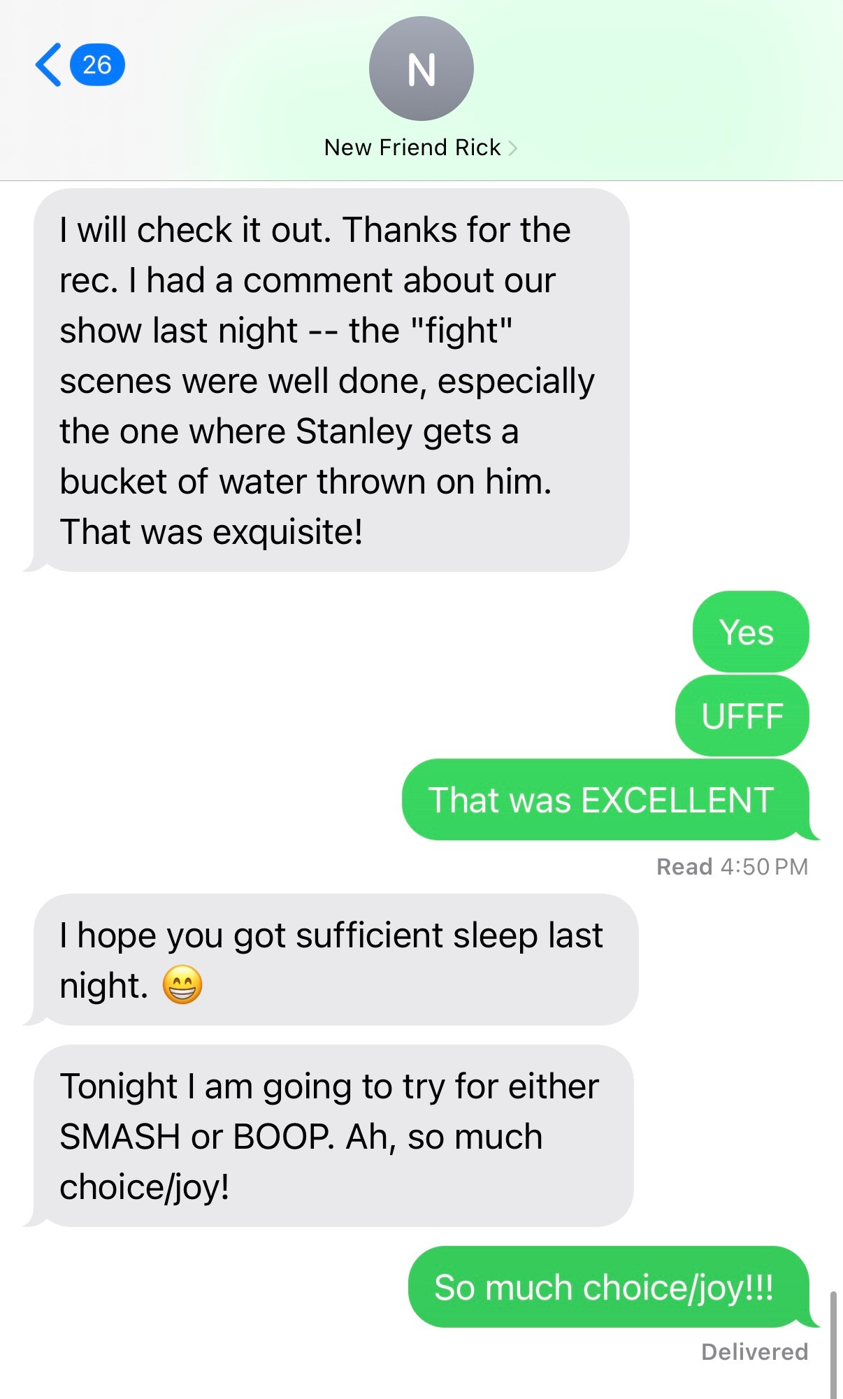 We started talking before the play, then during intermission, and then—because we were clearly destined to be scene partners in this particular act of my life—after.